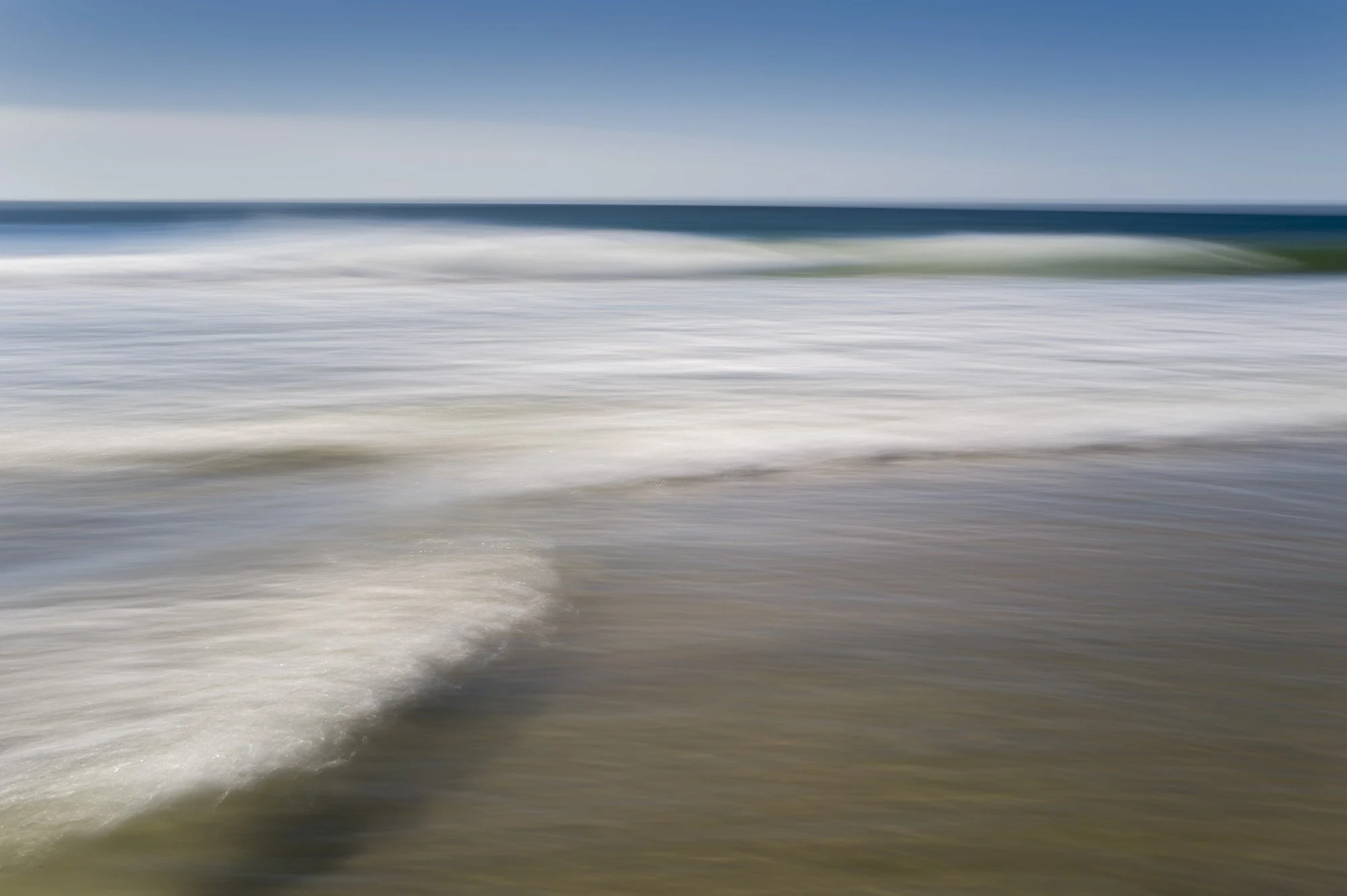 The unique qualities of Long Island's East End – its light reflecting on vast bodies of water and its flat pastoral landscapes create a unique environment that has inspired artists for generations. Pollock, Krasner, Motherwell, Rothko, all painted here, inspired by surrounding ocean landscapes. This series captures the changing Atlantic ocean and light as experienced over the course of the summer from the beach in Quogue, Long Island. There's something mystical about the ocean's edge that draws us in. Perhaps it's encoded in our DNA—the pull toward the place where life began, where our ancestors first crawled from sea to shore. For many, the longing to be near water runs deep, an ancient recognition of home. This series explores that primal connection, examining the blurred boundary between ocean and land. The beaches of Long Island never stop moving. Sand shifts with every tide, carving sandbars and channels that can last only hours or, maybe days, before the water reshapes them. A place where destruction and creation can be witnessed as beauty. This past summer, an offshore hurricane pounded the beach. As the powerful waves hit the dunes you couldn't tell where land ended and sea began. The ocean overtook solid ground; the sand turned to liquid. But what at first looked like shear chaos revealed something beautiful and simple—everything flowing together, no real border between sea and sand. This phenomenon called for a different photographic approach—a visual syntax that would capture not only the appearance of this borderless state, but its essential nature. How could a still image show the endless exchange of solid and liquid, between permanence and change? By moving my camera with the waves, timing each exposure to their speed, I dissolved the line between elements. Colors bleed and merge like watercolors in rain. The eye searches for familiar anchors—horizon, shoreline, breaking wave—but finds instead an imagined ocean landscape.